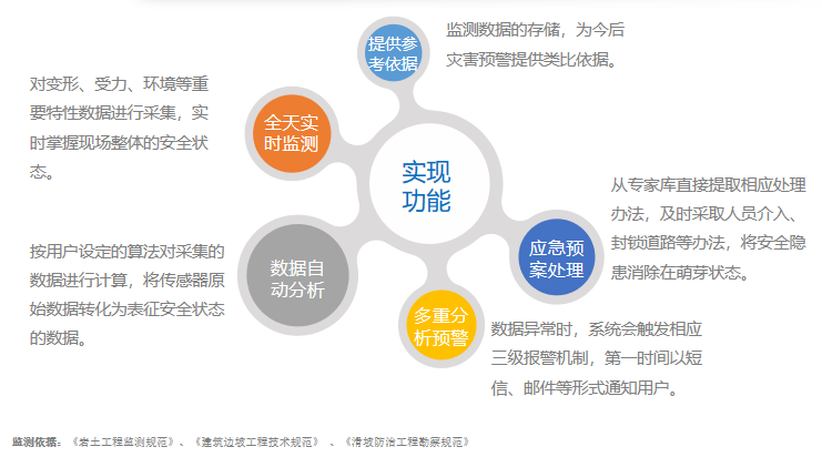 将结构健康监测与物联网结构体系、云计算、局域网/通讯网等多网无缝连接等技术结合,建立一套智能边坡健康监测系统,为边坡日常养护、管理和突发事件应急处置发挥重大作用。